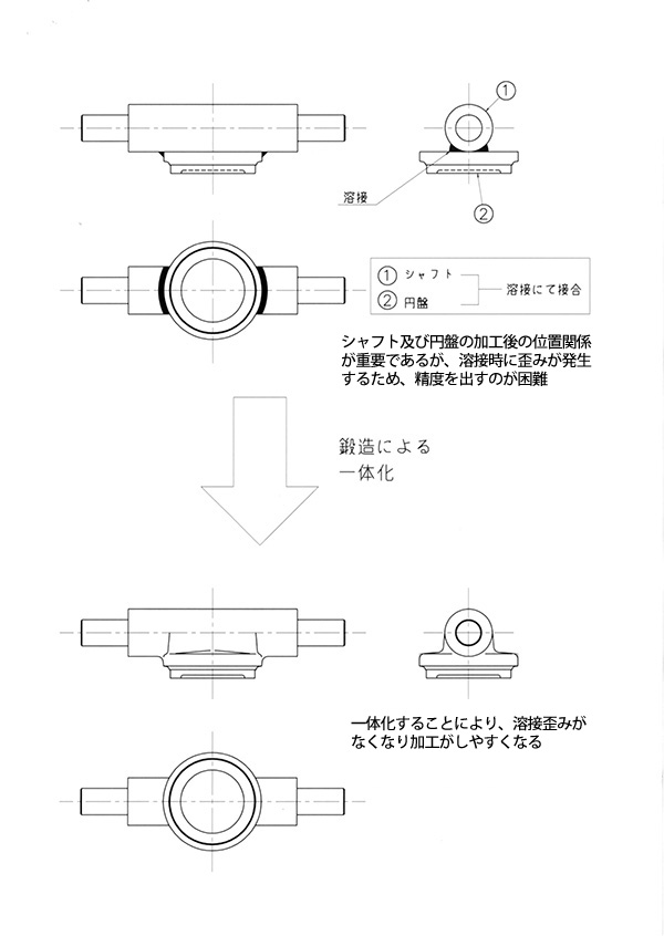 従来はシャフト部分と円盤部分が分かれており、 それぞれの部品を溶接で接合していましたが、 溶接部の強度や溶接後の寸法精度を確保することが困難なため その両方の問題を解決する方法として、鍛造による一体化を行いました。
